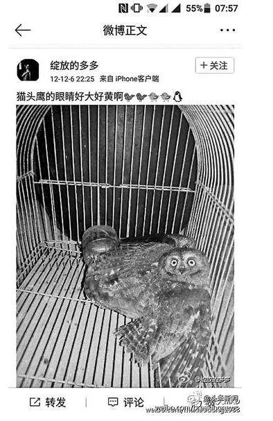 除了食用穿山甲等動物外,“綻放的多多”還曾在微博中曬出被關在籠子里的貓頭鷹和穿山甲等照片。14日,北京青年報記者注意到,“綻放的多多”已將所有微博清空,且更換了微博名字。