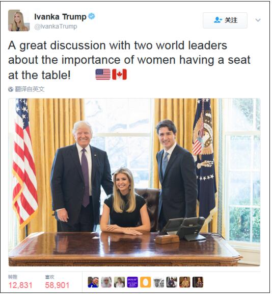 美國第一女兒周一在白宮的政策會議上首次露面,與到訪的加拿大總理賈斯廷·特魯多和她父親特朗普討論建立工作小組幫助商業女性。會議期間她發推文說,“就女性占有一席之地的重要性,與兩位世界領袖進行了成功的討論。”并附上一張在橢圓形辦公室的照片:伊萬卡坐在辦公桌后面,美國總統站在右邊,把手搭在她背上,加拿大總理站在她左邊。