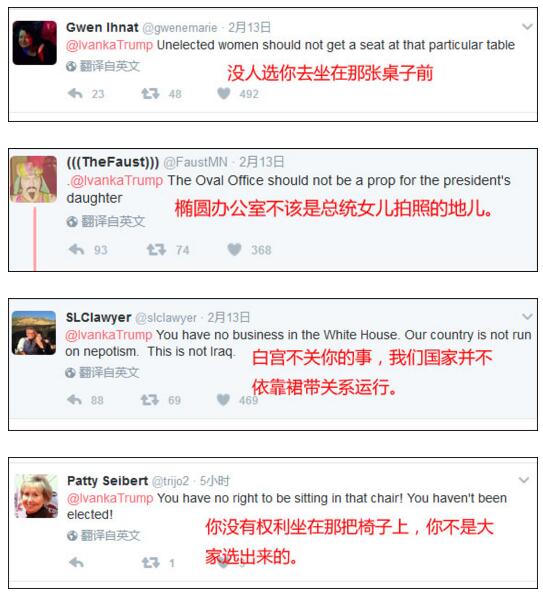 這張本想宣揚女性權利地位的照片,卻在社交媒體上引發軒然大波。很多人指責伊萬卡坐到總統的椅子上“不成體統”“不合適”,他們說“除了總統,沒人應該坐在那里。”“這不是你父親主持的電視秀,這是白宮。”“從那張椅子上挪開!”“這照片真的很沒品。”有人干脆說,“你不屬于這張椅子和白宮,回家養孩子去。”還一些人抱怨,當很多其他合格的女性應該參加那個會議時,伊萬卡沒資格與外國領導人會面。