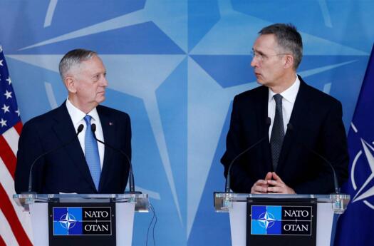 美國防長馬蒂斯和北約秘書長斯托爾滕貝格出席記者會。