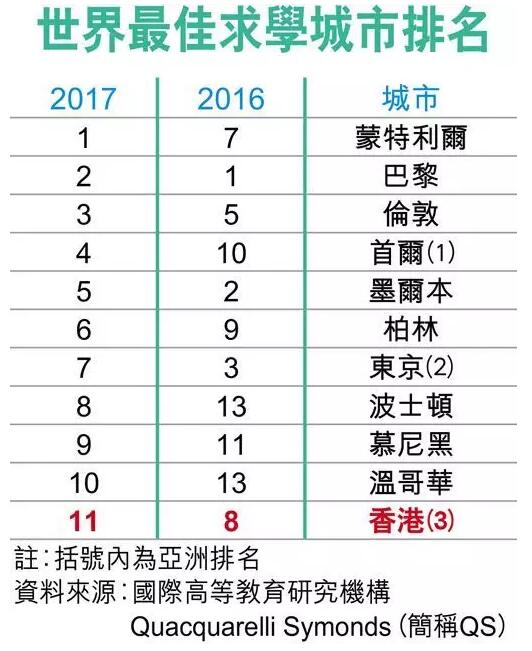 14日,國際高等教育研究機構QS(Quacquarelli Symonds)公布100個世界最佳求學城市排名,本港位居全球第11位,比去年跌3位,在亞洲位居第3,落后于首爾和東京。機構認為本港因消費價格和污染等因素影響,拖累排名。