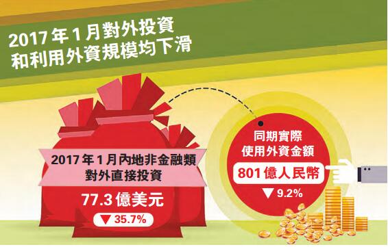 【香港商報网訊】中國商務部昨日發布的最新數據顯示,1月中國實際使用外資金額801億元(人民幣,下同),同比下降9.2%;1月中國對外非金融類直接投資金額約77.3億美元,同比大幅下降35.7%,比2016年12月降低4.6%。這是過去一年來,中國對外投資首次同比負增長。