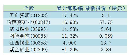 港股銅礦概念股方面,據智通財經統計,Escondida銅礦工會罷工消息宣布以來,五礦資源(01208)累計漲逾17%,哈薩克礦業(00847)也累計漲16.9%。
