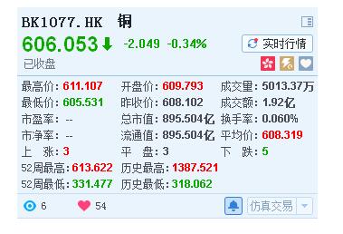 今日,港股市場上的銅板塊收報606.053,跌0.34%。個股方面,洛陽鉬業(03993)、中國有色礦業(01258)、及紫金礦業(02899)漲幅居前,分別漲4.76%、4.17%、1.43%,而五礦資源(01208)下跌3.73%,跌幅居前,此外,網智金控(00985)也跌1.67%,哈薩克礦業(00847)跌1.53%。