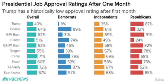蓋洛普在2月13日至2月15日發起了意向針對特朗普支持率的投票,並將結果與過去9位總統的首月支持率進行了比較。調查共覆蓋了1527名成年投票者,大約有3個點的邊際誤差。