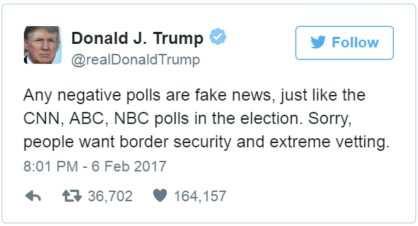 不過按照特朗普Twitter上的說法,他不會受到支持率下跌的幹擾。因為本月初,他在推特上聲稱:“任何負面的民意都是假消息”。