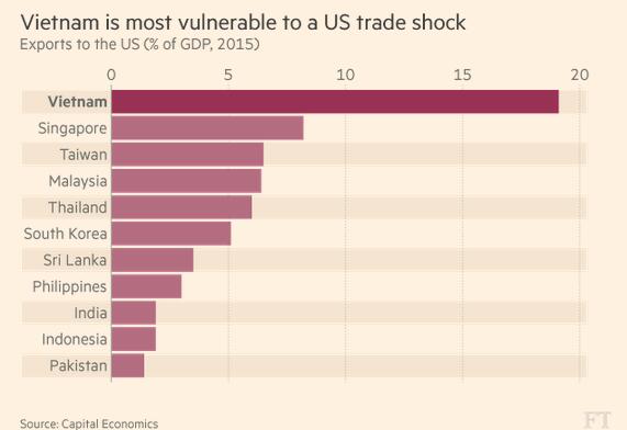 如果美國選擇中國作為發泄保護主義怒火的唯一目標,越南仍將受到影響,因為該國對華出口占到其總出口的約10%。中間產品占其對華出口的比例越來越高,這些產品在中國進行加工,然后再出口至美國等目的地。