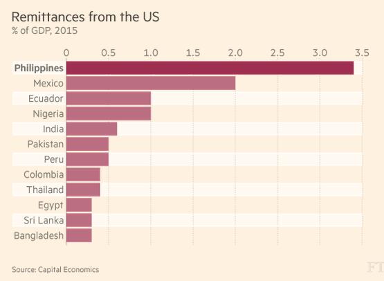 從一個不同角度來看,菲律賓也很脆弱。在商品貿易方面,菲律賓對美國的出口額相當于其GDP的3%左右,在美國采取限制進口的措施(比如通過邊境調整稅)時,該國受影響程度低于其他亞洲新興國家。