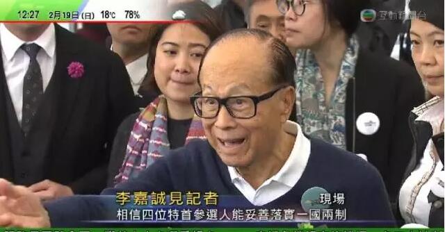 綜合港媒報道,香港首富、長和系主席李嘉誠2月19日出席活動時對傳媒表示:不會在行政長官選舉提名期提名任何一位參選人,惟強調投票期間會參加投票。他強調,下屆特首應該要做到兩大原則:即落實《基本法》與“一國兩制”;貫徹香港法治。