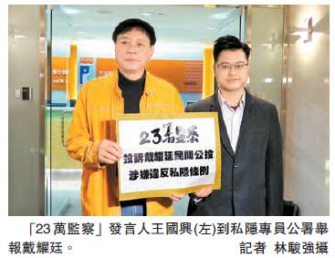 王國興直言,「23萬監察」為此到私隱專員公署作出強烈投訴,要求公署立即介入事件,並展開循規調查,審視上述投票活動的細節是否違反《個人資料(私隱)條例》,了解市民的個人資料是否被濫用甚至被盜用,並調查「雷動聲納」系統的保安措施是否足夠能確保個人資料私隱安全。