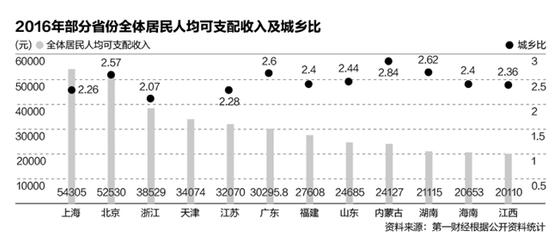 第一財經記者通過對2016年各省份的全體居民、城鎮居民和農村居民的人均可支配收入等多個指標的統計發現,目前有6個省份的居民人均可支配收入突破了3萬元大關;在城鄉平衡發展方面,浙江的城鄉差距最小,西部地區最大。