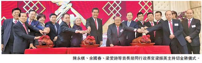 【香港商報網訊】記者謝巧玲、李嘉倩報道:香港廣東社團總會昨日假九龍灣百樂門舉行丁酉年新春團拜,行政長官梁振英、中聯辦副主任楊健等蒞臨主禮,并聯同全國政協常委、該會主席陳永棋,全國政協常委、創會主席余國春及各位首長會董主持切金豬儀式,向台下600多位各界來賓舉杯祝酒,恭祝祖國國泰民安,香港百業興旺。各社團首長亦藉這聚會溝通聯誼,氣氛歡快熱烈。(尚有相關消息刊A13版)