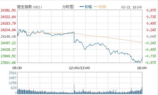 美股昨日因美國總統紀念日休市一天。恒生指數今早高開0.12%,開盤后曾倒跌,低見24142點后重拾升勢,恒指升穿昨日高位,高見24213點,其后走勢反復,午后港股跌幅擴大,最高跌逾兩百點,失守24000點,低見23909點。截至收盤,恒生指數報23963.63點,跌0.76%;國企指數報10408.56點,跌0.35%;紅籌指數報3873.14點,跌0.61%。大市成交額877.04億。