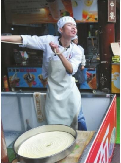 田波“風騷”地邊拉面邊跳舞,豐富的表情吸引了游客圍觀。