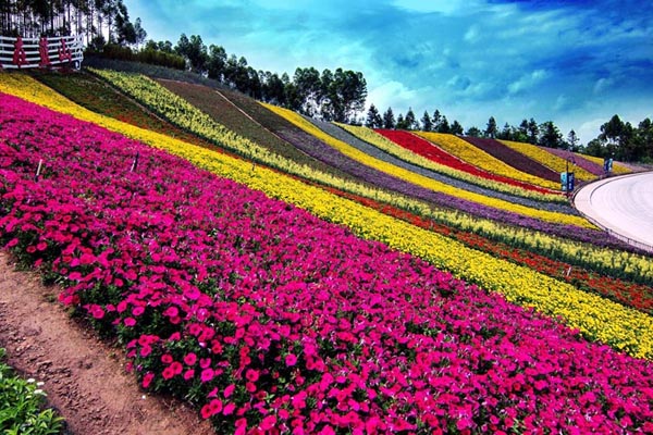在閩南地區,3月的十里藍山瑪琪雅朵花海正等待遊人的到來。瑪琪雅朵景區山坡種各色名花異草,色彩斑斕炫目,像絲帶,像彩虹。繽紛的花色有紅、黃、粉、白和多彩複色,多姿多采,讓人感受春天的浪漫。