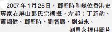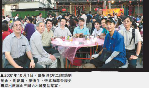 鄧聖時先生和我是忘年之交。2005年,我應陳坤耀校長和劉智鵬博士邀請到嶺南大學駐校研究香港歷史。嶺南大學和屏山相距不遠。我多次到屏山坑頭村他的丁屋探訪他,一起探討鄉土歷史。他也曾多次邀請我參加屏山村民的聚會,一起吃盆菜,品嘗九大簋。近年他患上認知障礙,不大認得人了。2016年8月20日下午,我去屏山探望他。他家人說他還在睡覺,他已不認得人了。我沒有打擾他,和他家人傾談一陣便離開了。哪知他在同年12月31號就老成凋謝、駕鶴西歸了,享年92歲。在葬禮上,他的兒子鄧廣賢寫了一副對聯:「愛國愛港愛屏山 護鄉護族護丁權」。這可說是對這位可敬的老人家一生很好的概括。