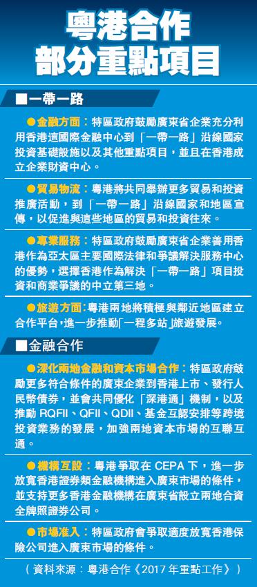 此外,粵港今年還將在「一帶一路」、青年工作、金融和資本市場合作、法律、會計及建築工程等專業服務領域、環境保護合作、教育合作及社會保障和服務、旅游合作方面等方面展開合作。