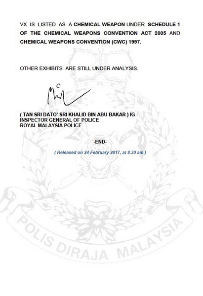 【香港商報網訊】據新華社英文大廣播2月24日報道,當天早間馬來西亞大警方正式公布了對此前在吉隆坡第二機場死亡的朝鮮男子尸體的尸檢結果。聲明中稱,死者面部和眼部均含有VX神經性毒劑。