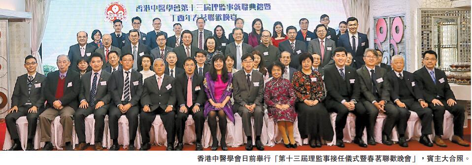 【香港商報網訊】記者余江強報道:香港中醫學會於日前在北角富臨皇宮舉行「第十三屆理監事接任儀式暨春茗聯歡晚會」,特邀食物及衛生局局長高永文、中聯辦協調部副部長張強、衛生署助理署長徐樂堅、香港中醫藥管理委員會中醫組主席黃杰、香港中醫發展委員會中醫業小組主席馮玖、廣州中醫藥大學副校長許能貴、香港中文大學中醫學院署理院長林志秀等嘉賓主禮,該會理監事顧問以及第十三屆理監事成員出席,場面熱鬧。