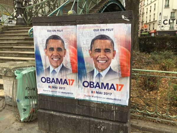 此外,法國有民眾發動連署拜託一位大家都很熟悉的大人物參加該國總統選戰,而他就是甫卸任的美國前總統奧巴馬。法國近日出現一個團體叫「Oba-ma17」,該團體架設了宣傳網站,還在巴黎張貼500張海報,上面除了奧巴馬肖像,還印着「OUI ON PEUT!」譯成英文即是「YES WE CAN」。該團體更指出,他們想要凸顯出民眾對於法國現有政治人物有多厭煩。