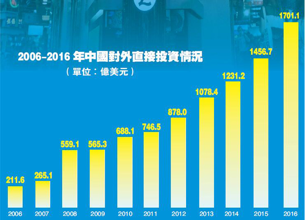 值得注意的是,2016年中國企業海外併購高潮迭起,一浪接一浪,中企在房地產、酒店、影城、娛樂業、體育俱樂部等領域的對外投資令世界為之側目。普華永道(港譯羅兵咸永道)發布2016年中國併購市場報告顯示,去年中國內地企業海外併購投資金額大增246%至2210億美元,投資金額增幅接近2015年的3.5倍,其中,有51宗大額海外投資交易金額超過了10億美元,超過2015年的兩倍。