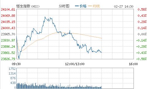 上周五美股三大指數尾段由跌轉升,道指第11日創收市新高,為30年以來收市連續創歷史新高最長紀錄。市場期待特朗普本周二(28 日)將在國會發表講話,或就稅收改革、放松監管、取消奧巴馬醫改計劃等立法訂下時間表。此外,美聯儲主席耶倫將于本周五發表講話。恒生指數今早低開0.1%,開盤后低開低走,之后大市跌幅一度收窄,其后走勢反復,午后跌幅擴大,最高跌逾百點,低見23822點,截至發稿,恒生指數跌0.37%,報23877.75點,成交額516.97億元。
