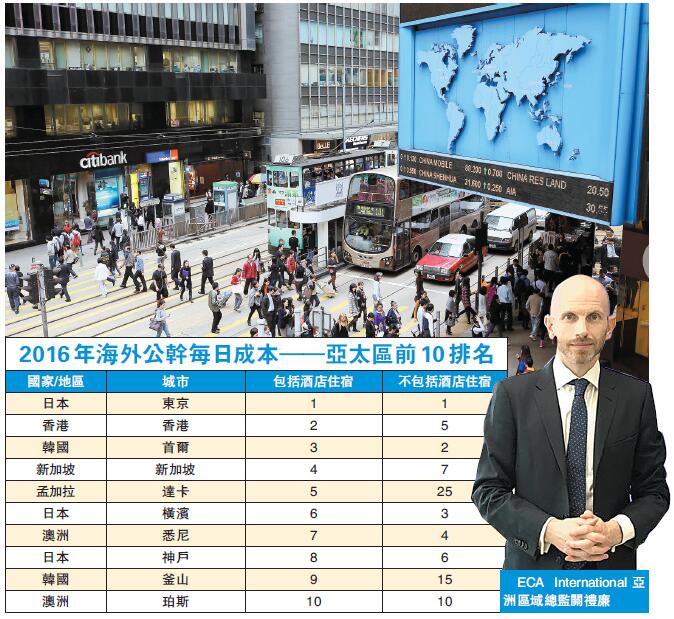 【香港商報網訊】記者劉佳玲報道:人力資源管理顧問公司ECAInternational發表最新《海外公幹每日成本報告》,顯示香港由去年亞太區公幹費用最昂貴城市下跌一位,位列第二。東京排名上升四位躍升為亞太區公幹費用最昂貴的城市。首爾、新加坡和孟加拉的達卡則分別位列第三至第五。