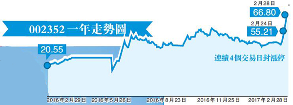 自2月24日正式登陸A股市場以來,順豐控股(002352.SZ)昨日開盤後短時間內再封漲停,已經連續第4個交易日股價封漲停,其市值也一飛沖天,截至昨日,該股市值達2795億元,穩居深市市值第一的寶座,但流通市值僅為88.83億元。受訪專家認為,作為中國新產業的代表,順豐控股近日備受資本市場的追捧是一種很正常的現象。從估值角度看,該股目前處於合理的估值水平,短期內市值有可能衝破3000億元。而基於其顯著的業務創新能力和新的盈利模式,該股未來可能會在現有的基礎上衍生出一系列新的利潤增長點,成長空間巨大。香港商報記者 朱輝豪