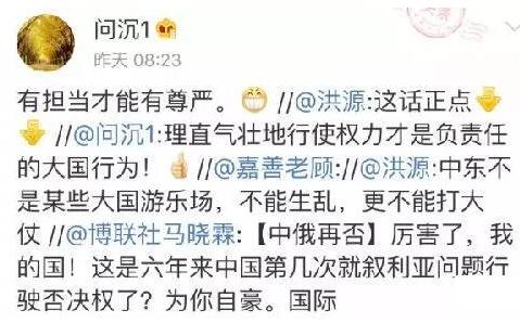 也許是因為中國已不是第一次行使否決權,這條有關“中俄再否決西方制裁敘利亞決議”的消息并未在國內輿論中產生很大漣漪。但仍有不少網友為中國點贊,稱贊“理直氣壯地行使權利才是負責任的大國行為”。