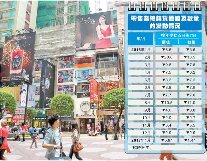 1月的零售業總銷貨價值的臨時估計為431億元,較2016年同月下跌0.9%,但跌幅比之前一個月的2.9%收窄,而扣除期間價格變動后,1月的零售業總銷貨數量的臨時估計較2016年同月下跌1.4%。