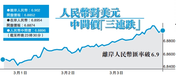 當天,中國官方公布人民幣對美元匯率中間價報6.8896,較前一交易日下調87個基點。至此,人民幣對美元中間價已是「三連跌」。