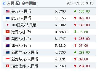 3月6日,人民幣(6.8870, -0.0083, -0.12%)兌美元中間價報6.8790,上周五中間價6.8896,升值106個基點。中間價結束上周的三連貶。周五官方收盤報6.8980,夜盤收盤報6.8990。