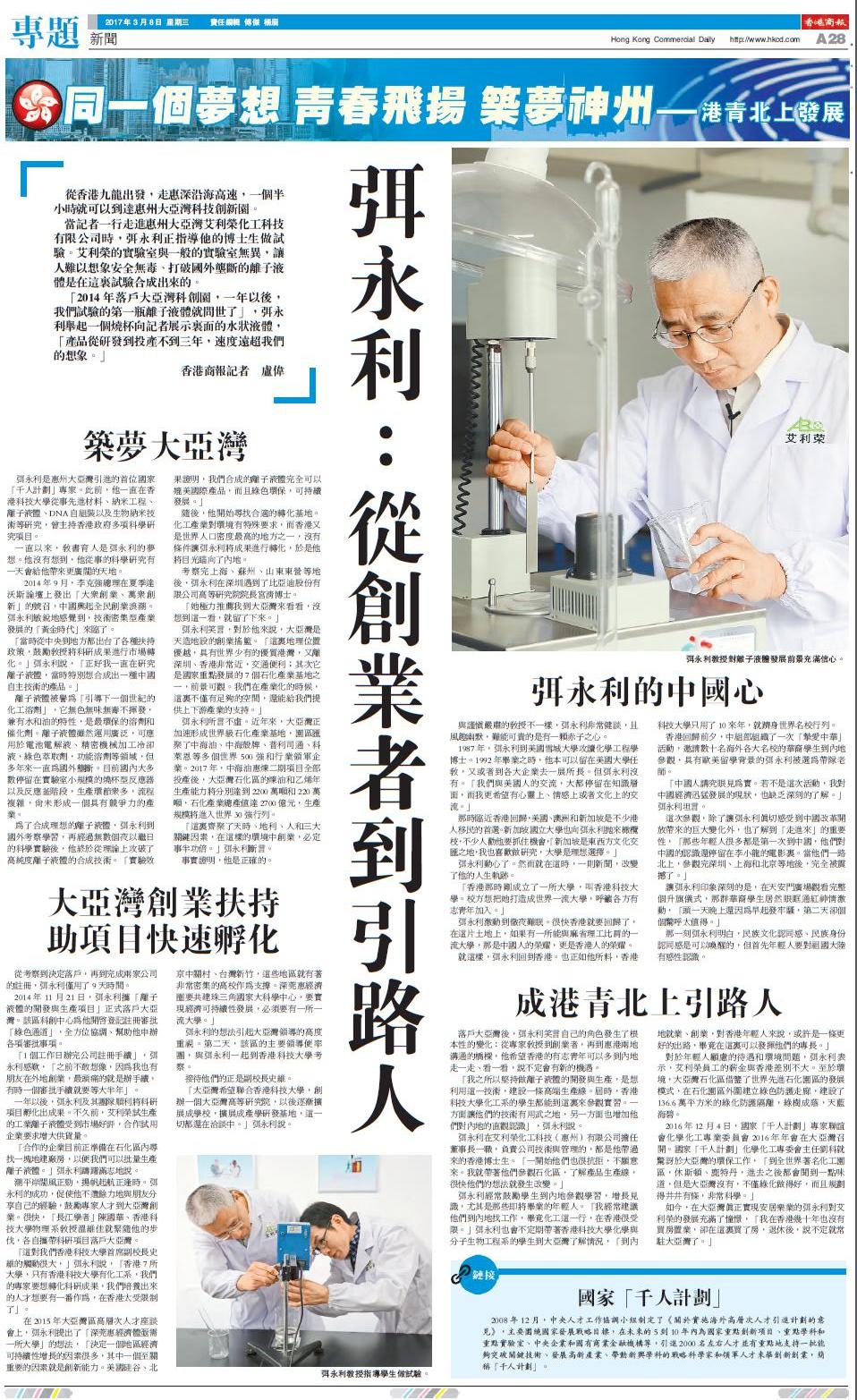 「這對我們香港科技大學首席副校長史維的觸動很大,」弭永利說,「香港7所大學,只有香港科技大學有化工系,我們的專家要想轉化科研成果,我們培養出來的人才想要有一番作為,在香港太受限制了」。