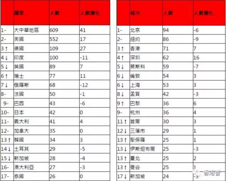 《2017胡潤全球富豪榜》,共計來自68個國家和地區,1811家企業的2257位十億美金富豪上榜,達歷史最高。上榜富豪的總財富比去年上升16%,達到55.9萬億元,相當於全球GDP的10.7%,與五年前的全球GDP相比上升2.3%。對全球十億美金富豪來說,過去一年是不錯的一年。1037位財富增長,343位新晉入榜。740位財富縮水,去年上榜的276位富豪今年跌出了榜單。大中華地區以609位元十億美金富豪第二年領先於552位的美國。胡潤表示:“中國和美國擁有世界上一半的十億美金富豪。”