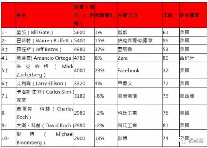 61歲的比爾·蓋茨以5600億元的財富蟬聯世界首富,巴菲特排名第二。53歲的亞馬遜創始人傑夫·貝佐斯財富上漲37%,躍居第三,馬克·紮克伯格首次進入前五。
