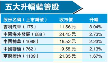 大市昨日成交689.96億元,較上日增加約63.27億元,較對上交易日增10%。資金追捧內房汽車股,吉利汽車(175)收報11.56元升8.04%,為升幅最大藍籌股。另一方面,汇控(005)收報63.15元跌0.08%,為表現最差藍籌。國企指數收報10280點升50點,恒指即月期貨收報23777點升107點。