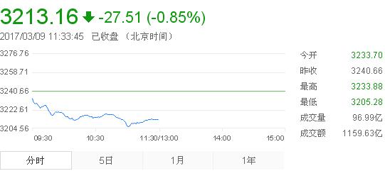 3月9日消息,滬深兩市股指早盤低開低走,滬指盤中一度跌超1%,報3205.28,創兩會以來新低,股指考驗3200點支撐。創業板早盤低開,隨后受盤中主題熱點缺乏影響,指數持續低位震蕩。截止上午收盤,滬指報3213.16,跌0.85%,創業板指報1957.90,跌0.34%。