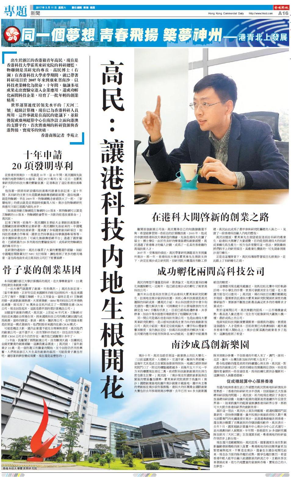 出生於浙江的香港籍青年高民,現在是香港科技大學霍英東研究院的科研總監,物聯網是其研究的專長。高民博士在香港科技大學求學期間,就已帶著科研項目於2007年來到廣東省南沙。以科技產業轉化為使命,十年間,他讓多項成果走出實驗室進入企業應用,還成功孵化兩間科技企業,培育了一批年輕的創業精英。