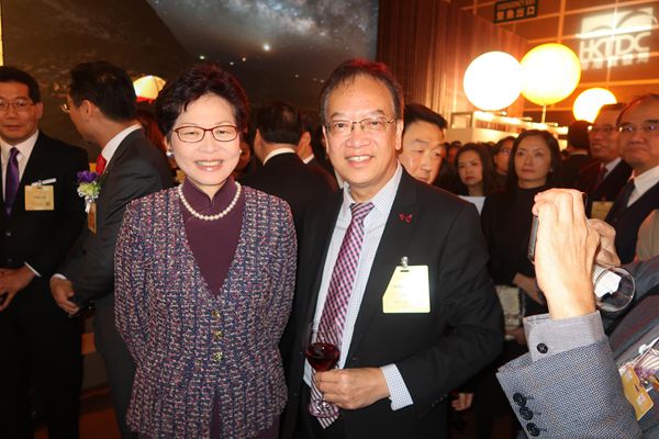 餐飲職業協會會長黃家和與林鄭月娥於去年貿發局50周年酒會合照。 資料圖片