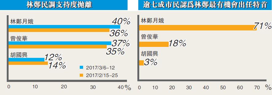 此外,隨著行政長官選舉投票日臨近,不少機構亦有進行各項民意調查,當中包括由經濟通及晴報聯合舉辦的「最後衝刺(3月2日至3月16日)」網上投票。截至昨日下午為止,共有7919名網民投下神聖一票,林鄭月娥以66%「得票」遙遙領先,曾俊華則以36%排第二名,胡國興僅獲2%網民支持,另有1%表示全部候選人均不支持。