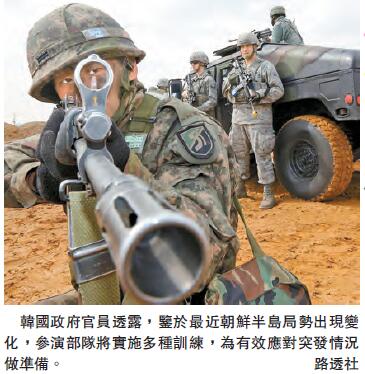 韓國政府一位高官透露,美軍特種兵將參加「關鍵決斷」和「禿鷲」軍演,參演規模比往年大,兵種也更多。最近朝鮮半島局勢出現變化,根據這種變化,軍隊需執行的任務也不同於以往,因此參演部隊將實施多種訓練,為有效應對突發情況做準備。訓練具體包括秘密滲透平壤、剿除戰爭指揮部、爆破戰爭指揮設施等任務。據悉,美國突擊隊、三角洲部隊、海軍特種作戰研究大隊(海豹第六分隊)、陸軍「綠色貝雷帽」特戰部隊等也將參與今次軍演。