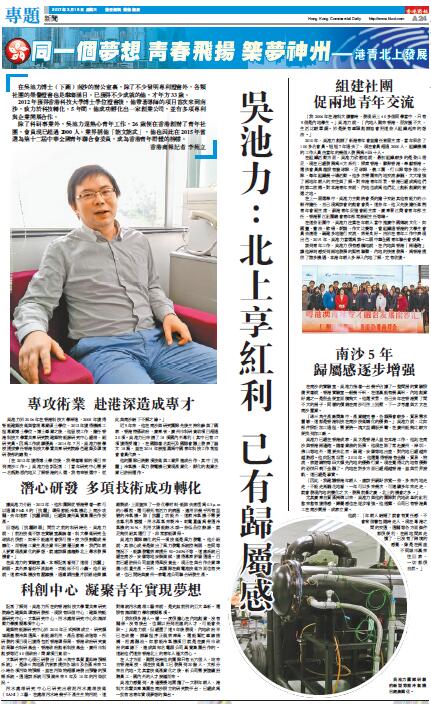 回想起「抗霾神器」問世之前的科研時光,吳池力說,「前沿技術不該在實驗室裏躺著,科大學術研究全球排名很前,如果不能應用會很可惜。校方很鼓勵成果轉化,而香港工業生產企業早已搬遷至廣東,我們年輕人要實現產業化的夢想,就應該順應趨勢北上尋求發展機會。」