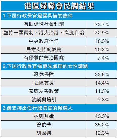 有婦女團體早前訪問了逾千名本港女性,發現最多女性表示下屆特首最需要具備的條件是有助促進社會和諧,其次為堅持「一國兩制、港人治港、高度自治」。她們認為下屆特首施政重點是紓緩房屋問題,其次是改善行政立法關係。被問到若明天是行政長官選舉會作如何選擇時,有四成三人表示支持林鄭月娥,支持曾俊華有三成半,胡國興僅得一成二。