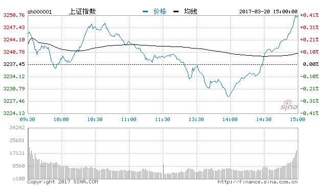 新浪財經訊 3月20日消息,早盤兩市小幅高開後震蕩下行,滬指今日強於創業板指,午盤後兩市反彈乏力,震蕩下行,臨近尾盤,兩市指數止跌回升,至收盤兩市指數雙雙翻紅,成交量較前一交易日放量。截至收盤,上證指數報3250.81點,漲幅0.41%,成交額2140億元;深證成指報10532.33點,漲幅0.16%,成交額2818億元。創業板指報1953.82點,漲幅0.21%。