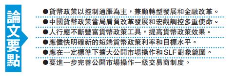 論文表示,從貨幣價格調控和利率走廊操作要求上看,人行必須明確短端政策目標利率,以此為中心確定利率走廊區間,結合日常的公開市場操作,有效開展市場利率引導。因而,應儘快明確新的短端貨幣政策利率和目標水平,在改進準備金付息方式和包括SLF在內的再貸款(再貼現)安排的同時,確定適宜寬度的利率走廊區間,形成具有公開、透明、可信的能夠真正穩定預期的利率走廊操作框架。