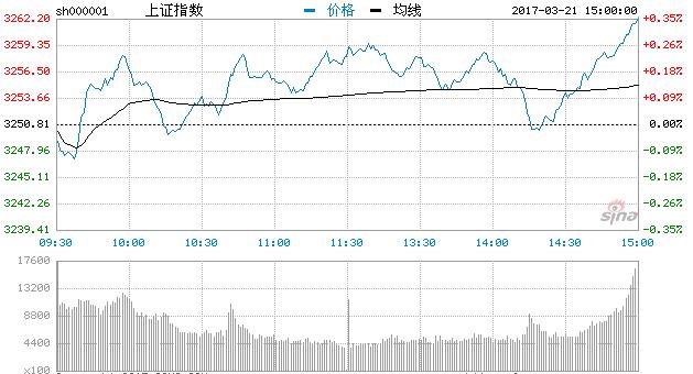 新浪財經訊 3月21日消息,早盤兩市低開後迅速翻紅,隨後兩只指數繼續維持窄幅整理走勢,走勢上總體平穩,滬指重新站上5日線,創業板今日繼續弱於滬指,沖高於十日線附近遇阻回落,尾盤翻紅,兩市全天成交量較前一日再度縮量。截至收盤,滬指上漲0.33%,報收3261點;深成指上漲0.52%,報收10586點;創業板上漲0.37%,報收1961點。