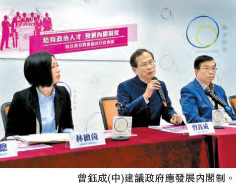 【香港商報网訊】記者潘仲男報道:立法會前主席曾鈺成籌組的智庫組織「香港願景」昨日發表檢討高官問責制及行政會議的報告,建議政府應發展內閣制度,改革招聘副局長的制度,及將問責官員的政治助理改為特別顧問等。