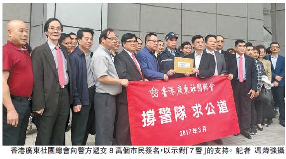 香港廣東社團總會為數約30人昨日到灣仔警察總部集會,并向警方遞交會方收集的8萬個簽名,以示對「7警」的支持。總會常務副主席梁亮勝表示,香港警隊在反占中期間,應對突發事件上的處理方法,受到了一些人不公平的指責和對待,承受了巨大的工作壓力和精神壓力。他指出,「7警」被判刑2年,并即時入獄,反觀曾健超則僅判5周,及可保釋上訴,該會認為判決不公平,支持「7警」上訴。