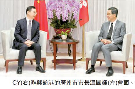 【香港商報网訊】行政長官梁振英(CY)昨日上午在行政長官辦公室與訪港的廣州市市長溫國輝會面,就雙方共同關心的課題交換意見。