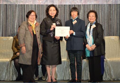 高寶齡(左一)、陳鳳英(右一)陪同梁唐青儀(左二)向李樂詩(右二)致送紀念品。